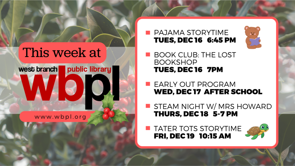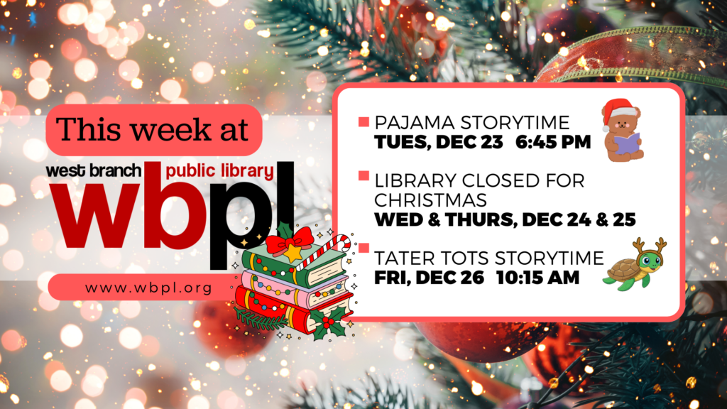 We’re closed Christmas Eve and Christmas Day, but in between, don’t miss the holiday fun at PJ Storytime and Tater Tots Storytime! Happy holidays to all our patrons and thanks for making our community rock!