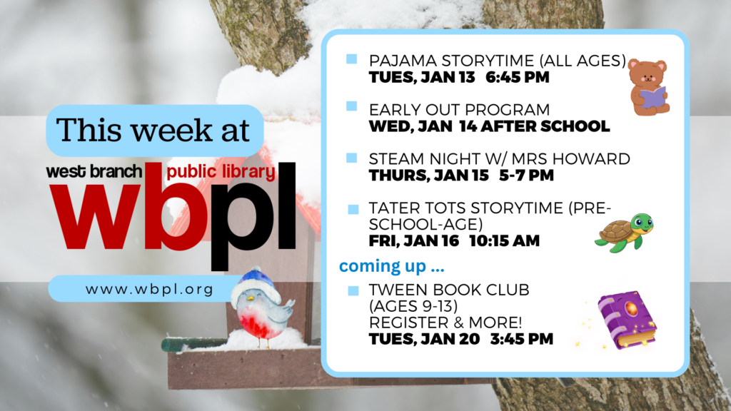 Are you ready for some STEAM? (it’s cold enough!) 😄 It’s STEAM Night week – join us for an evening of fun activities with Mrs. Howard this Thursday! Our Tween Book Club first meeting is fast approaching next Tuesday – for more info and to sign up to get a book, stop by the library!