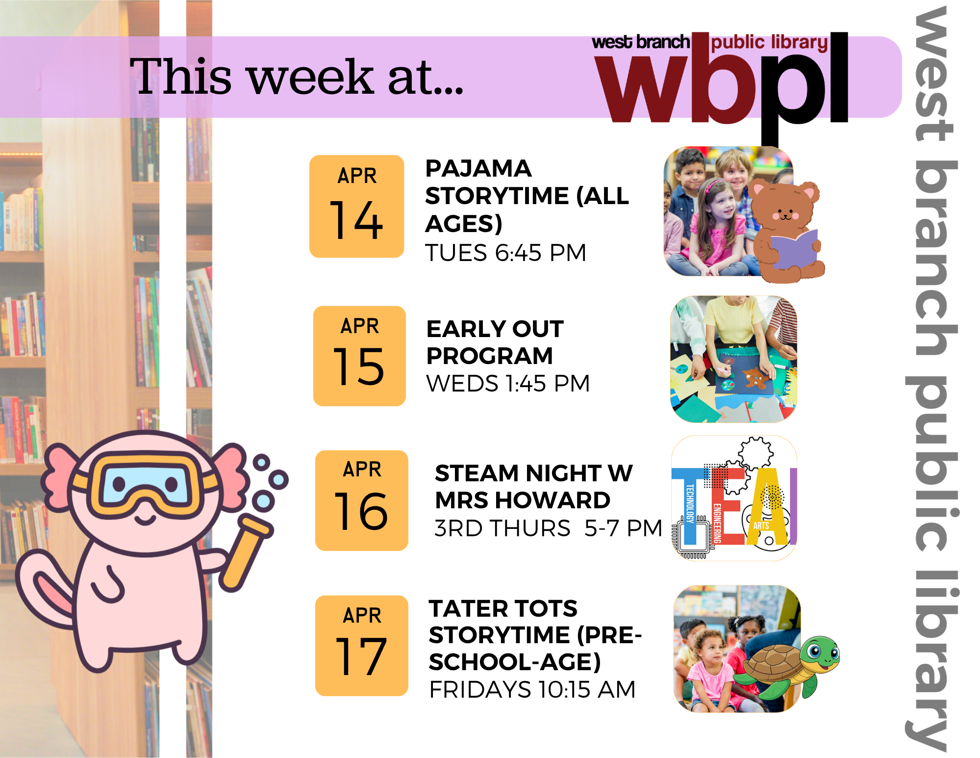 Is your Easter candy all eaten yet? 😄🐰🌷 We’ve got a bunch of fun this week, with a book club and Storytimes! No Early Out this week so there won’t be any structured activities, but everyone is welcome after school! Don’t miss this coming Sunday’s program where you’ll meet Laura the Kid Dinosaur! 🦕