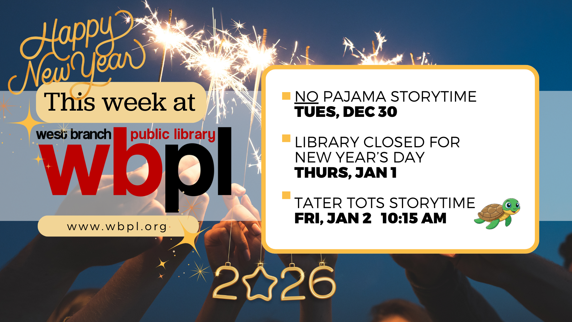 Happy New Year! 🎉 Right in the middle of the week, we’ll be closed on New Year’s Day (yes, we’re open New Year’s Eve!). Ms. Mary is out of town on Dec 30 so no PJ Storytime … til next year! We’ll see you at Tater Tots Storytime, our first program of 2026! 🌟
