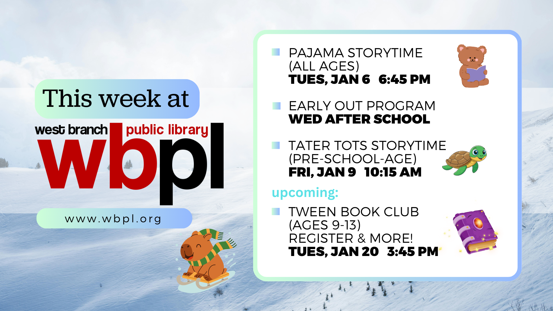 We made it through the holidays! Let’s make 2026 awesome! Join us for Storytimes or After School activities this week, and next week is signup, snacks & fun for our NEW Tween Book Club!