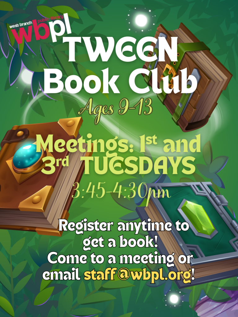 Tweens (kids ages 9-13) are invited to join us for a monthly book club! We’ll enjoy a group activity and a discussion on this month’s book. Current Book: Escape from Mr. Lemoncello’s Library by Chris Grabenstein.