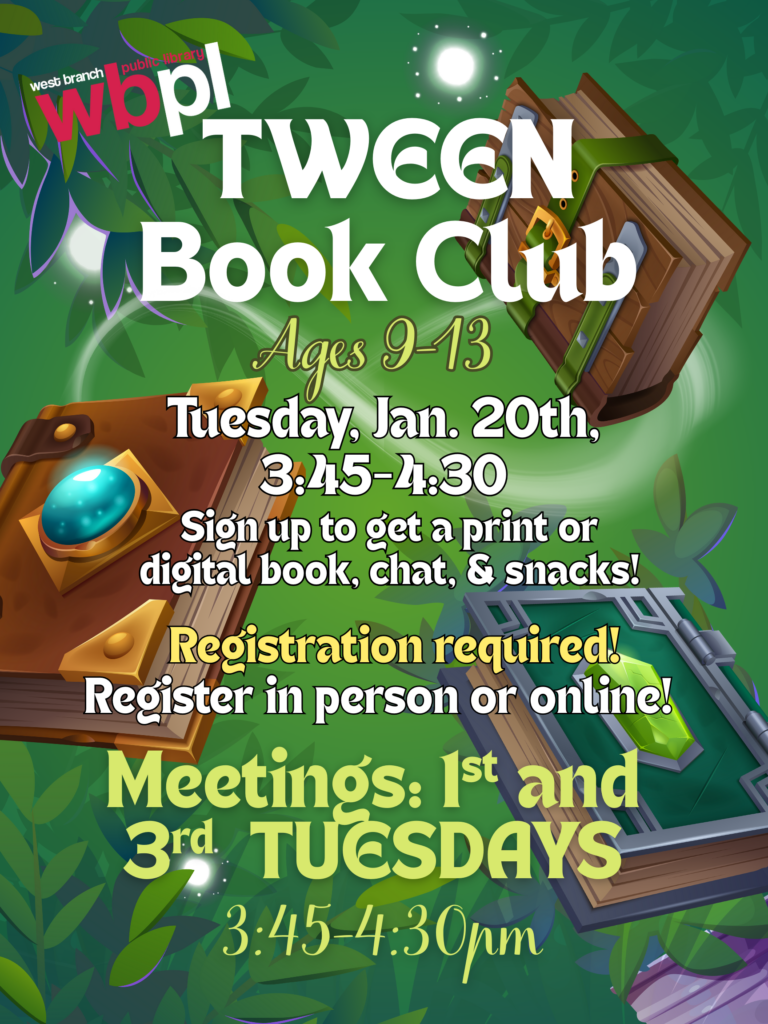 To register and get a copy of the book, join us at the library on January 20th from 3:45-4:30 email staff@wbpl.org. Print, ebook, and e-audiobooks are available. Registration is required so we can get all the books you’ll need! After you sign up, have a snack, hang out, and let’s get started reading!