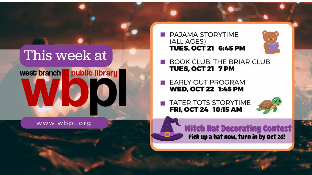 Hello spooky people! There’s plenty of October fun at the library! 🎃 Join us for either of our fun storytimes, or activities for Early Out on Wednesday. There’s a second Early Out on Thursday and your kids are welcome to have fun at the library then too! Book Club is talking about The Briar Club this Tuesday; everyone is welcome, hop in anytime! ✨ The Witch Hat Contest has some great entries already – there’s less than a week left to enter!