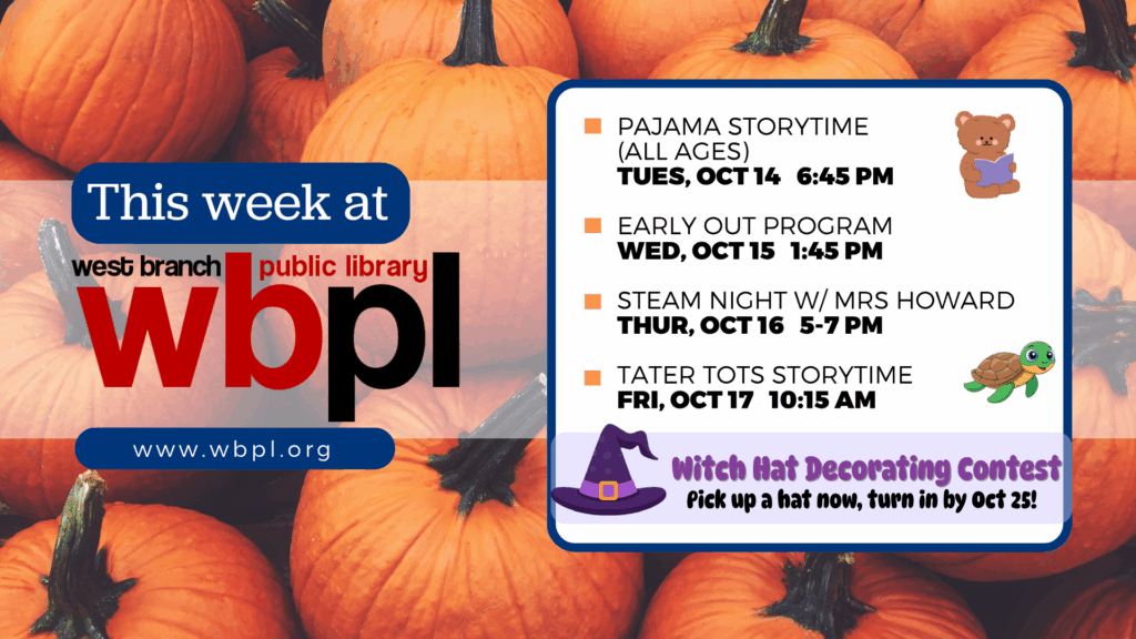 Hello spooky people! There’s plenty of October fun at the library! 🎃 Join us for either of our fun storytimes, or activities for Early Out on Wednesday. There’s a second Early Out on Thursday and your kids are welcome to have fun at the library then too! Book Club is talking about The Briar Club this Tuesday; everyone is welcome, hop in anytime! ✨ The Witch Hat Contest has some great entries already – there’s less than a week left to enter!