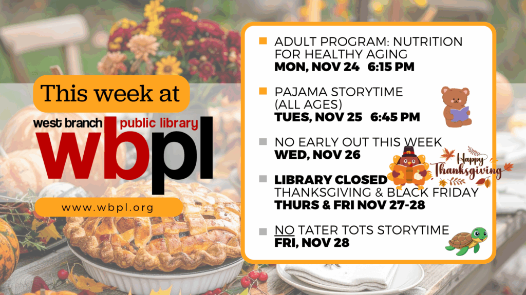 Turkey Day is almost here! 🦃 Want to learn how you or your loved ones can keep healthy and eating deliciously as you age? 😋 Monday is adult program night and we’re welcoming Heritage AAA to teach us about nutrition! Join us for PJ Storytime on Tuesday night, then we’ll wind down for the holiday weekend – the library will be CLOSED Thurs and Fri, so no Tater Tots Storytime this week. Have a wonderful Thanksgiving! 🍂
