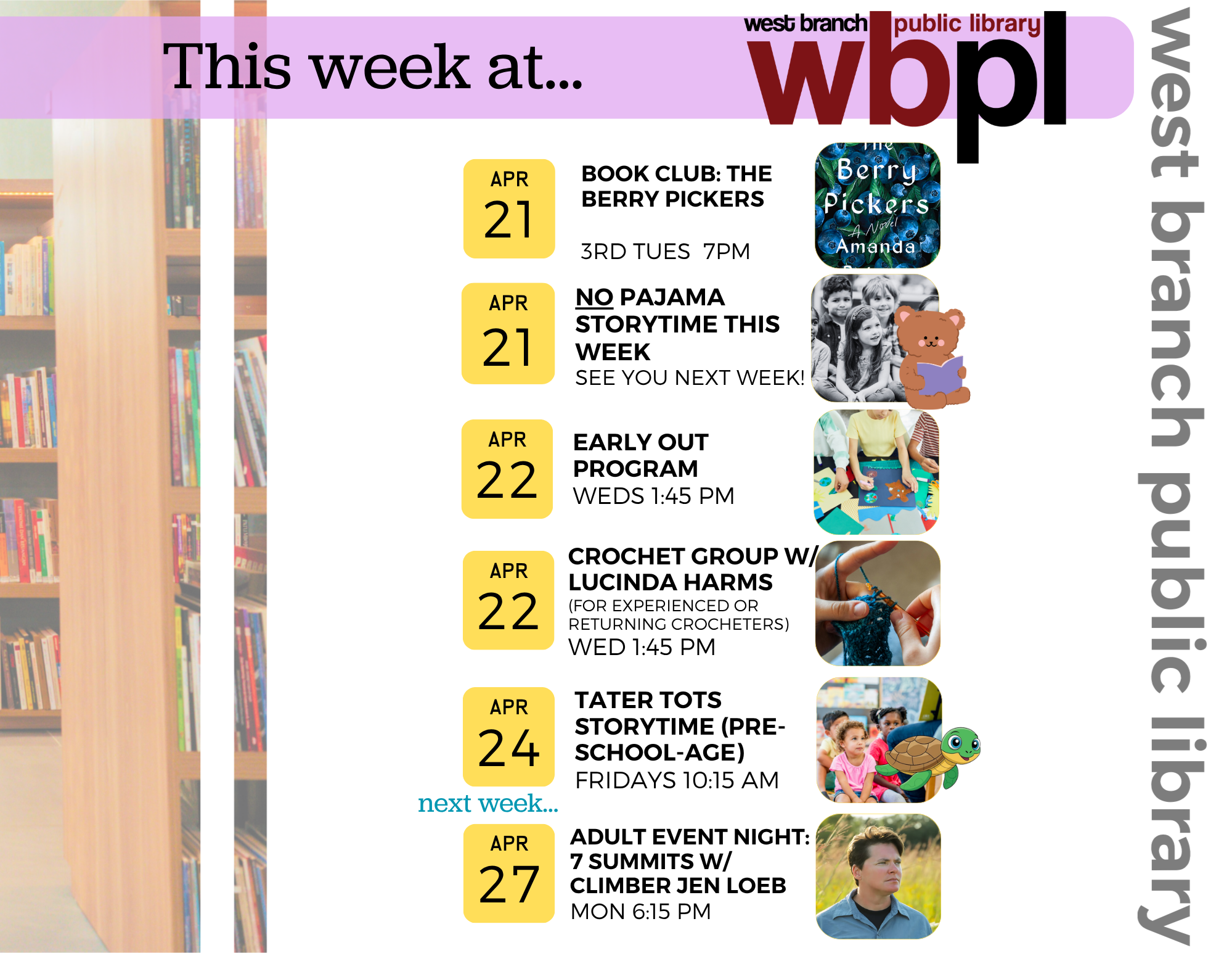 Mrs. Buol is off part of this week so there will be NO PJ Storytime, or Tween Book Club this week; Storytime will be back next week, and May 5 will be our finale Tween Book Club for the season! Our adult Book Club is meeting this Tuesday to talk about The Berry Pickers. Wednesday we’re welcoming back Lucinda Harms to hang out with our crocheters from last time, or anyone else who already knows how to knit, crochet or any other fiber arts to join them! (This is for returning crocheters or experienced people only. Beginners, let us know if you want to learn a new stitchery art, and we’ll schedule one!) Coming up next Monday, don’t miss the chance to talk to Jen Loeb, who climbed the highest peak on every continent! (That’s a vicarious adventure if I’ve ever heard one!)