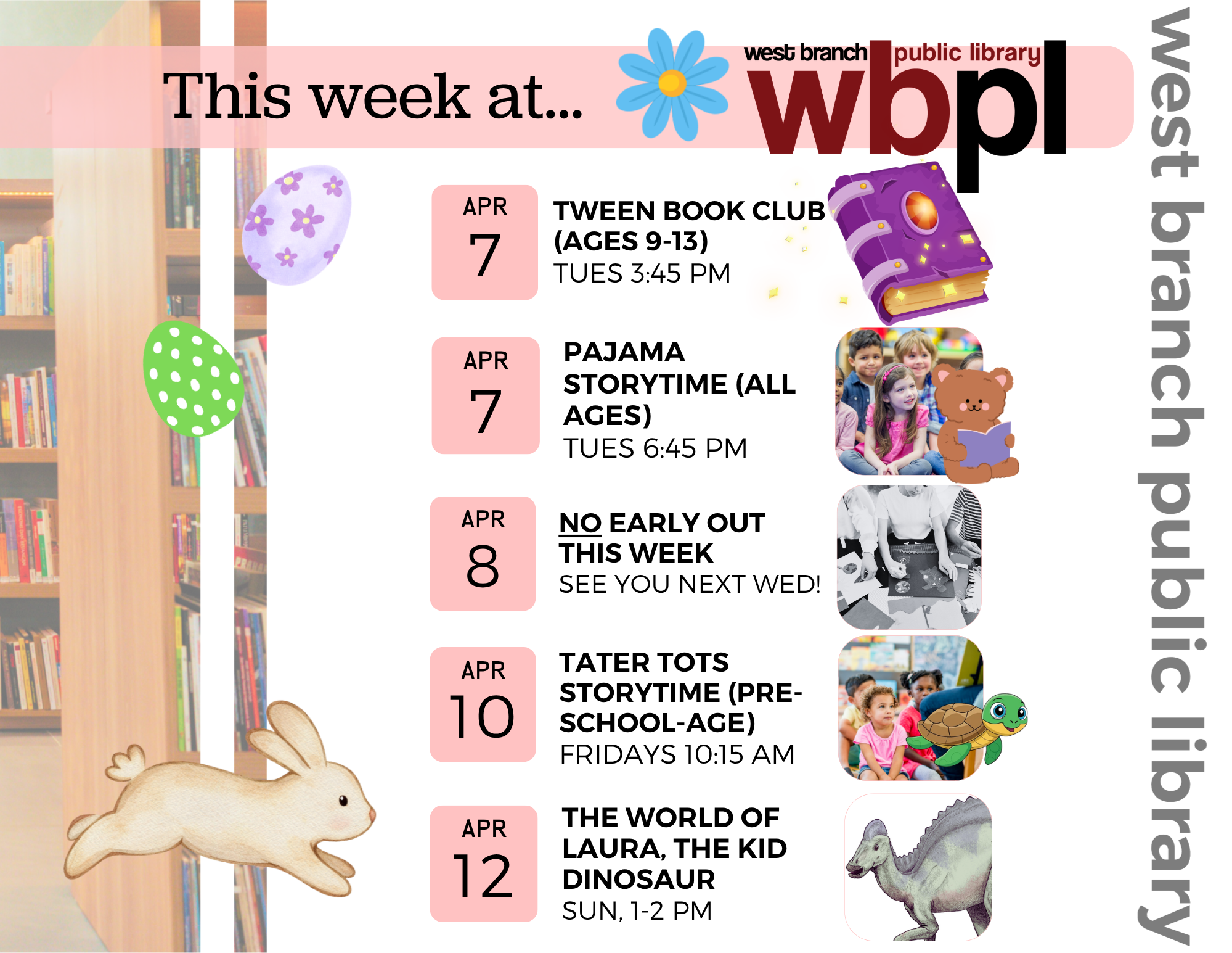 Is your Easter candy all eaten yet? 😄🐰🌷 We’ve got a bunch of fun this week, with a book club and Storytimes! No Early Out this week so there won’t be any structured activities, but everyone is welcome after school! Don’t miss this coming Sunday’s program where you’ll meet Laura the Kid Dinosaur! 🦕