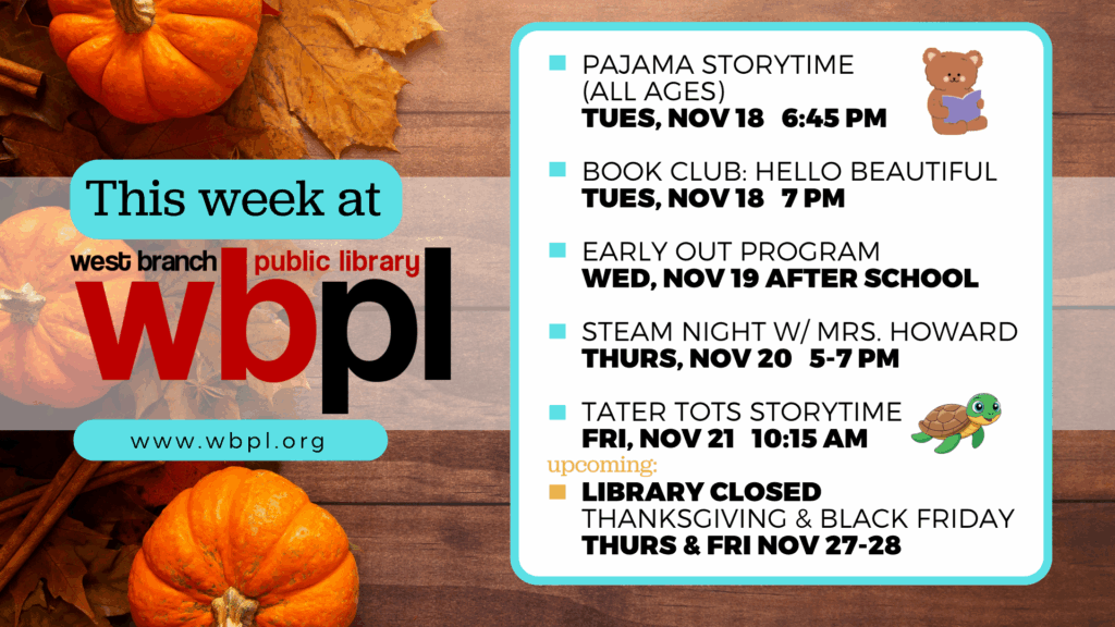 It’s a jam packed week of fun at the library! 🔬🖌⭐Our monthly STEAM Night is this Thursday with tons of hands-on activities for all ages, the Book Club is meeting this week to talk about Hello Beautiful (any curious minds are welcome!), and our weekly Storytimes and Early Out activities have got you covered. 🦃 Remember: Thanksgiving is next week! We’ll be closed that Thursday and Friday.