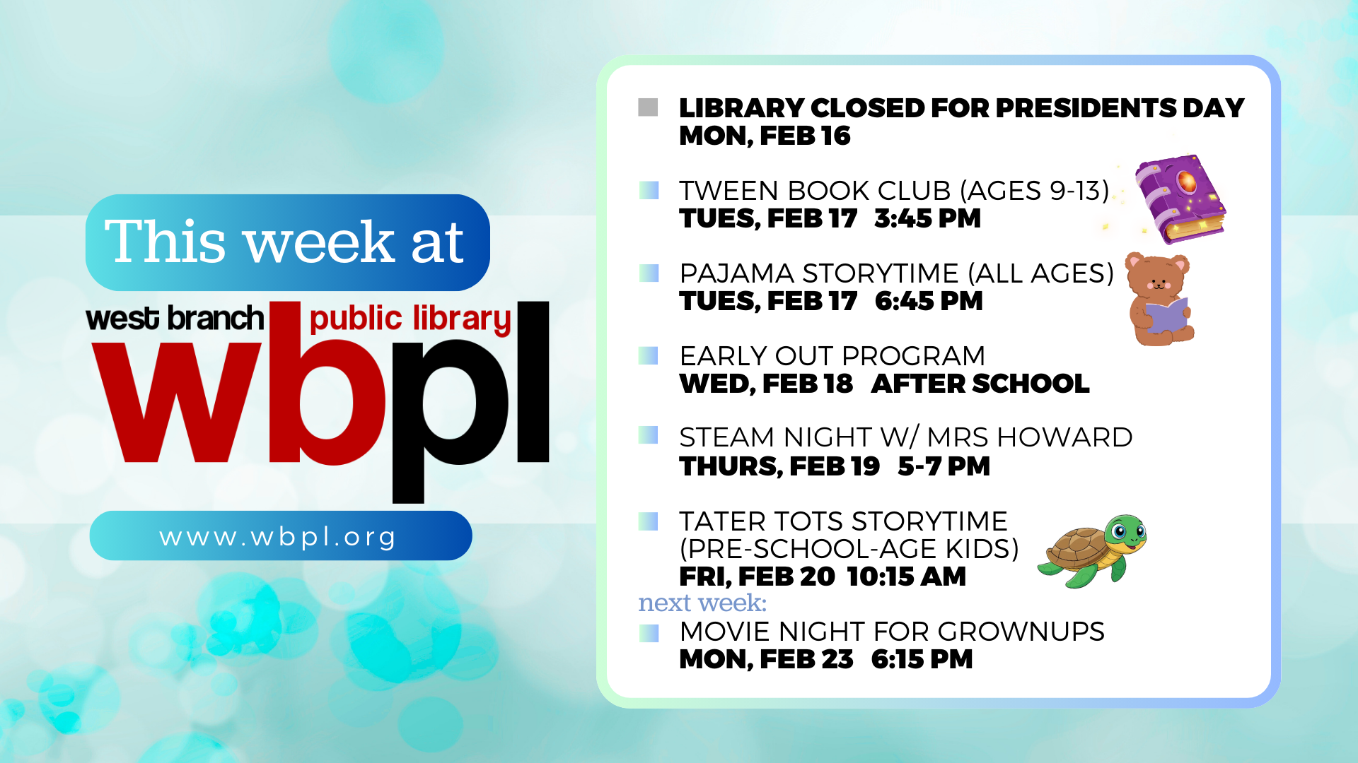 The library is closed on Monday for Presidents Day. But after that, we’re jam-packed with fun things to do! Our usual programs are joined by the Tween Book Club after school on Tuesday, and it’s STEAM week on Thursday, grab your critical thinking caps and have some fun with Mrs. Howard! Looking forward, next Monday is Adult Night, join us for a recent movie on the big screen. Make the most of the warm weather and have fun!