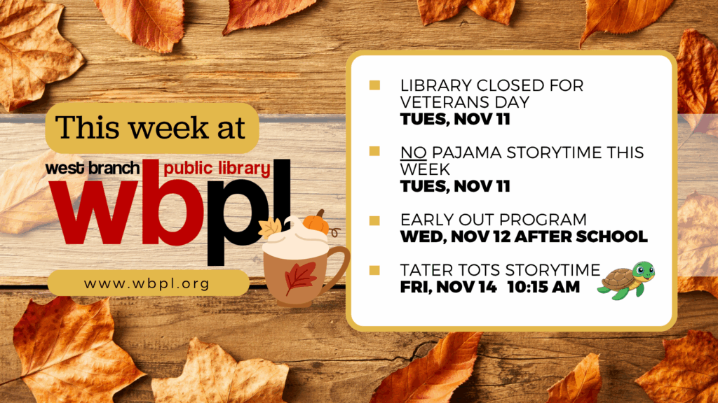 The library will be closed Tuesday of this week, because it’s Veteran’s Day – thank you to everyone who served! That means there’s no PJ Storytime this week, but we’ll see you next week! Early Out Program and Tater Tots Storytime are coming up like normal. Brrr, it’s cold – have a warm beverage this week and remember to take a moment for yourself!